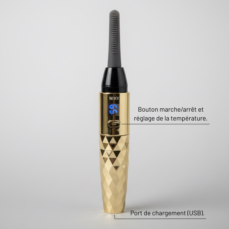 Le recourbe-cils chauffant NIIKY maintient une courbure parfaite de vos cils toute la journée, en éliminant les inconvénients des méthodes classiques : fini le pincement douloureux, les rendez-vous en institut et les produits irritants.